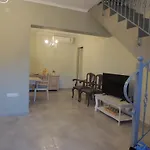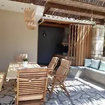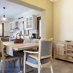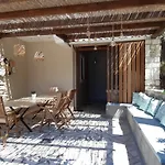This Geni property includes an outdoor dining area with a refrigerator, a cooktop, and kitchenware. The seafood restaurant Pirofani Taverna is located 1.5 km away and serves Greek dishes.